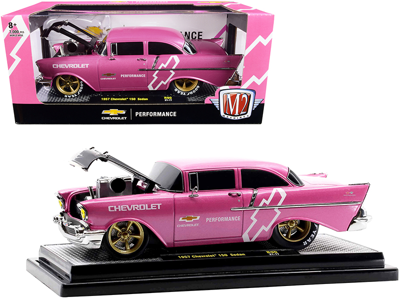 - Brand new 1/24 scale diecast car model of 1957 Chevrolet 150 Sedan Medium Pink Pearl with Black Hood and Graphics Limited Edition to 7000 pieces Worldwide die cast model car by M2 Machines.
