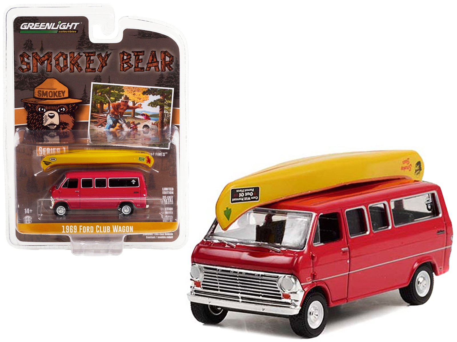 - Brand new 1/64 scale diecast car model of 1969 Ford Club Wagon Van Red with Canoe on Roof “Care Will Prevent 9 Out Of 10 Forest Fires!” “Smokey Bear” Series 1 die cast model car by Greenlight.