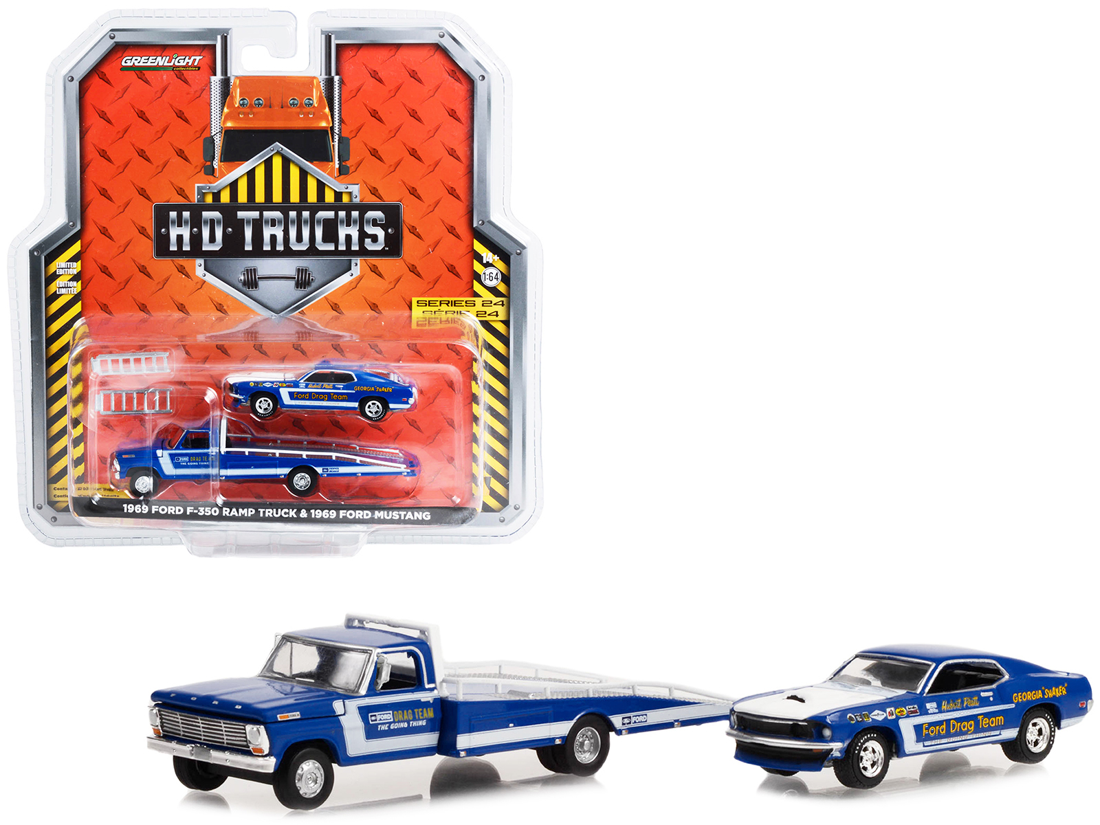 - Brand new 1/64 scale diecast car models of 1969 Ford F-350 Ramp Truck Blue “The Going Thing” and 1969 Ford Mustang Blue “Hubert Platt’s Georgia Shaker” “Ford Drag Team” “Heavy Duty H.D. Trucks” Series 24 die cast model cars by Greenlight.